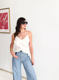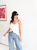 Este top tiene spaghetti straps ajustables, detalles de ruffles y un acabado semi-sheer que lo hace delicado pero con un toque moderno.