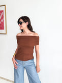 Este off-shoulder knit top tiene una textura delicada que abraza tu figura sin perder comodidad.